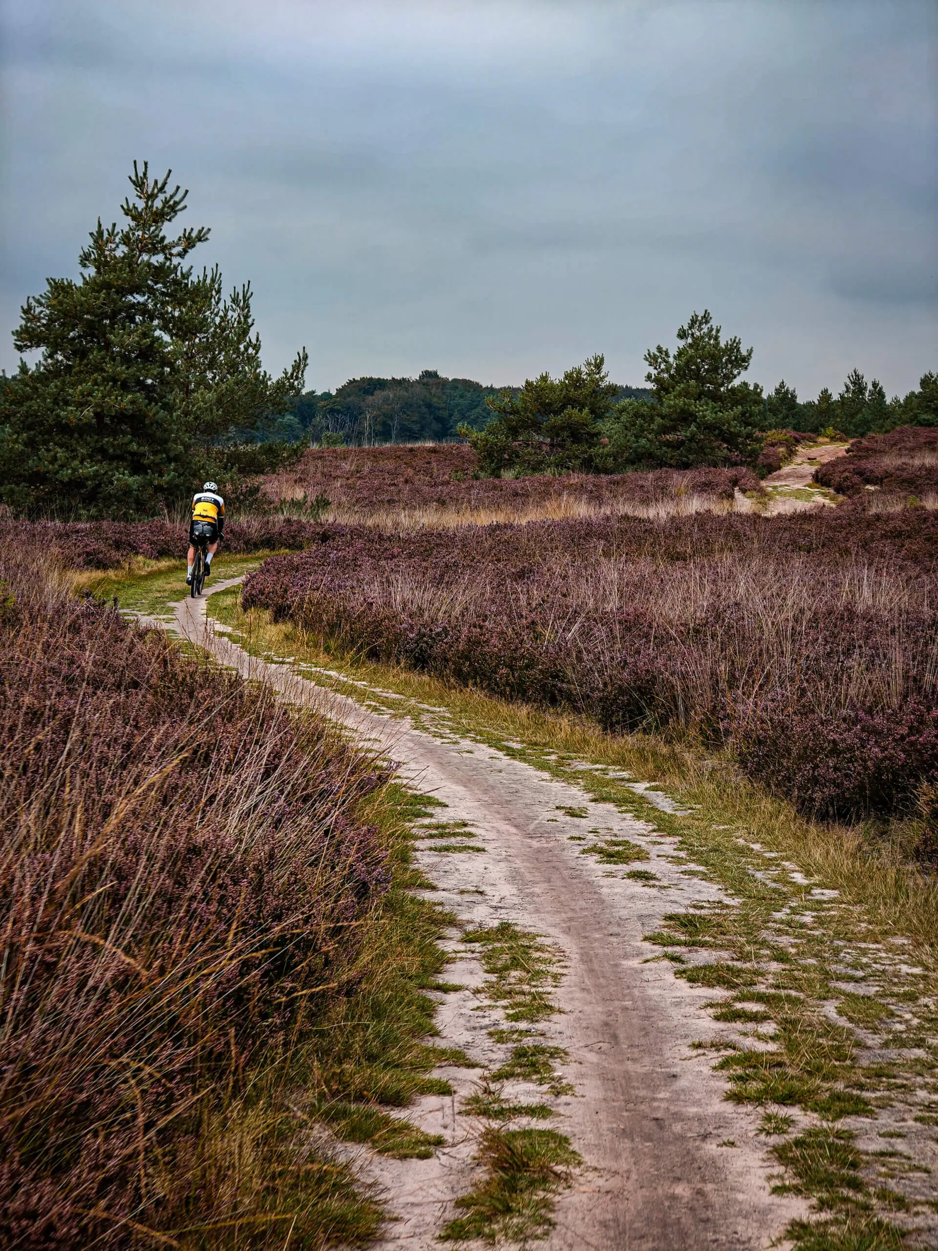 Als dag 2 al een droom was, dan begon dag 3 bij Ermelo iets pittiger. Door de ondergrond die redelijk omgeploegd was door het onderhoud in het bos, werd het hilarisch gravelfietsen, hoort erbij en dan maar het beste er van maken. Maar we werden al snel beloond: de heide was prachtig, de zon scheen fel en we hadden ons geen beter weer kunnen wensen.